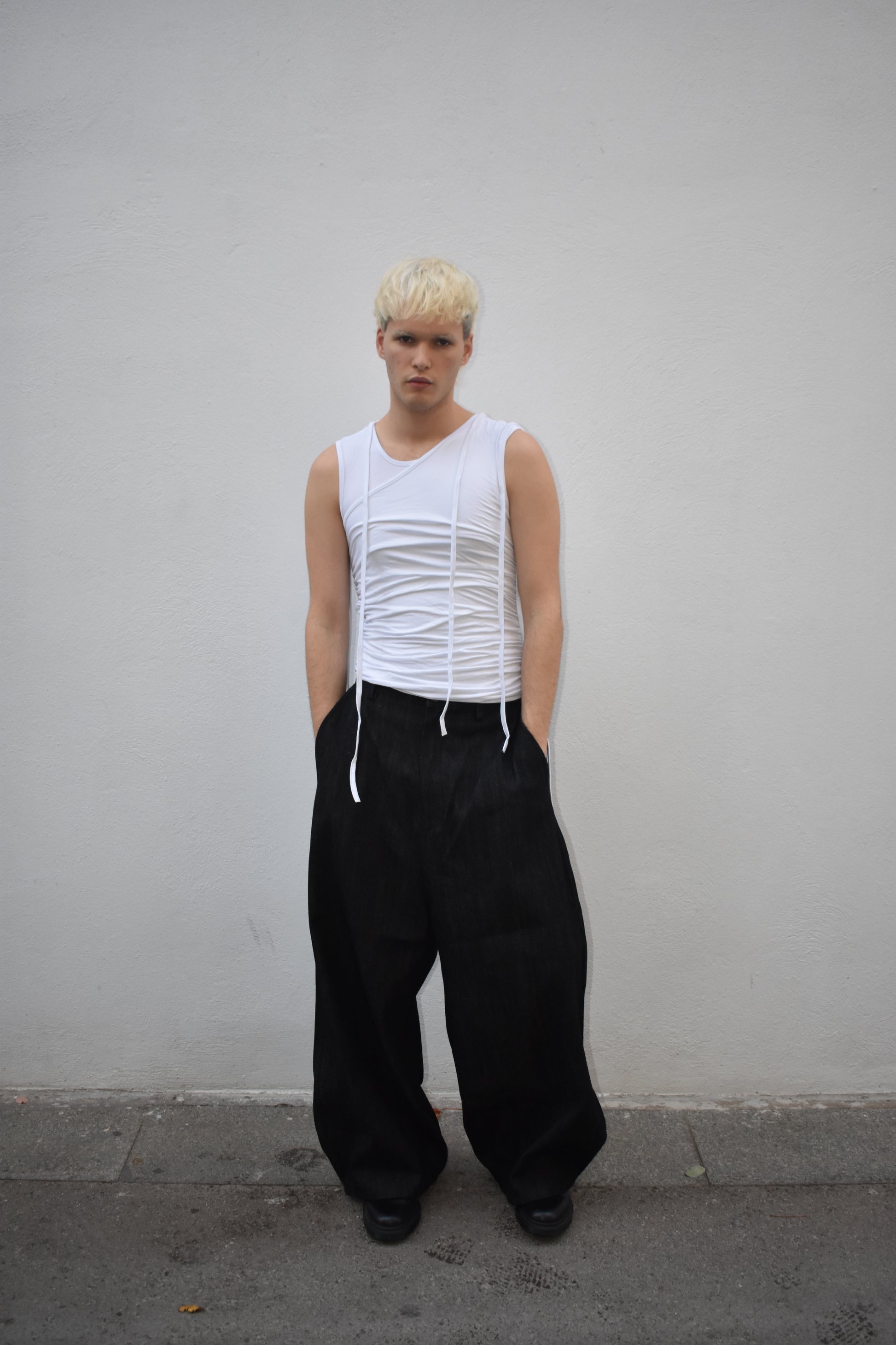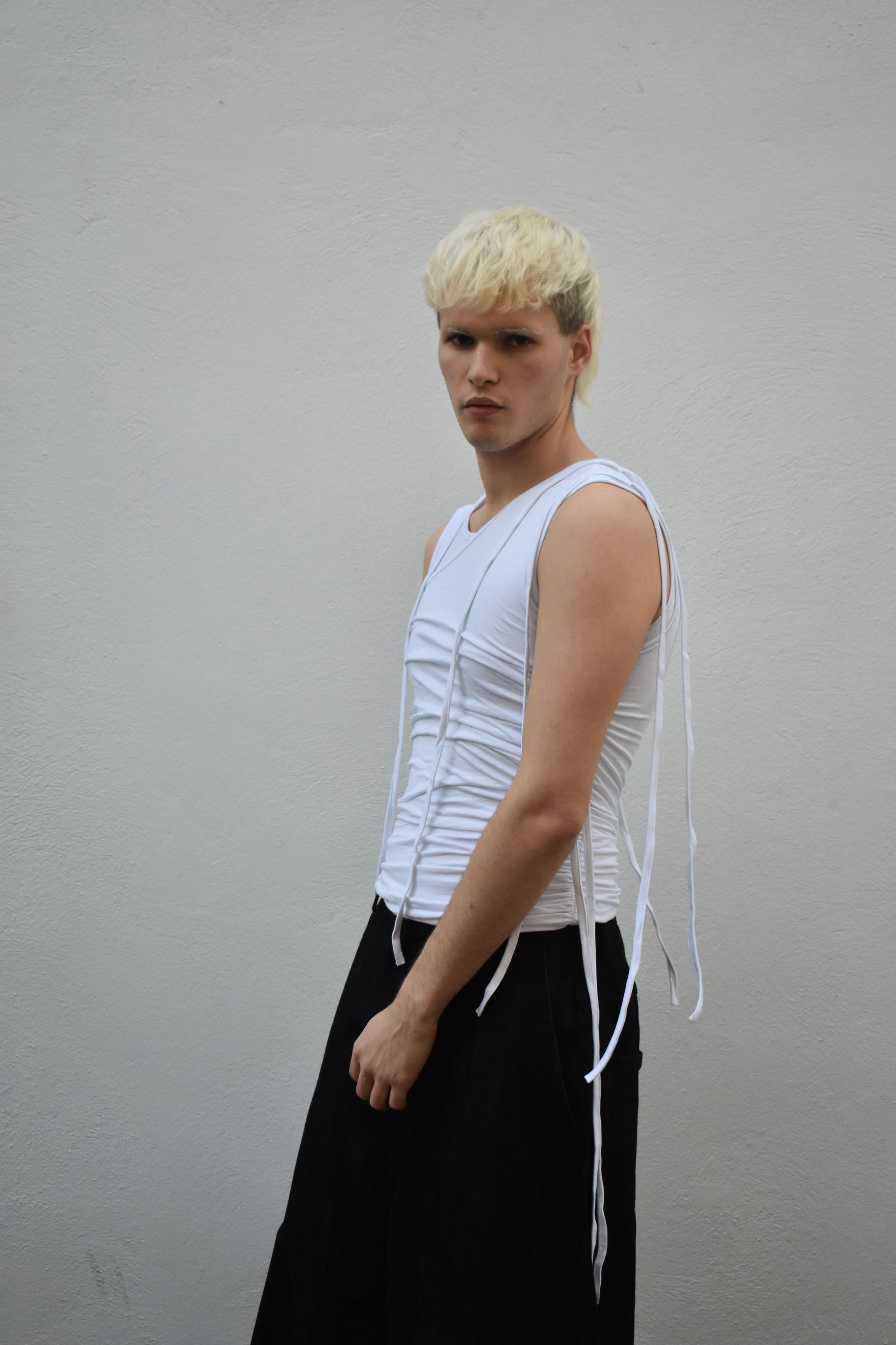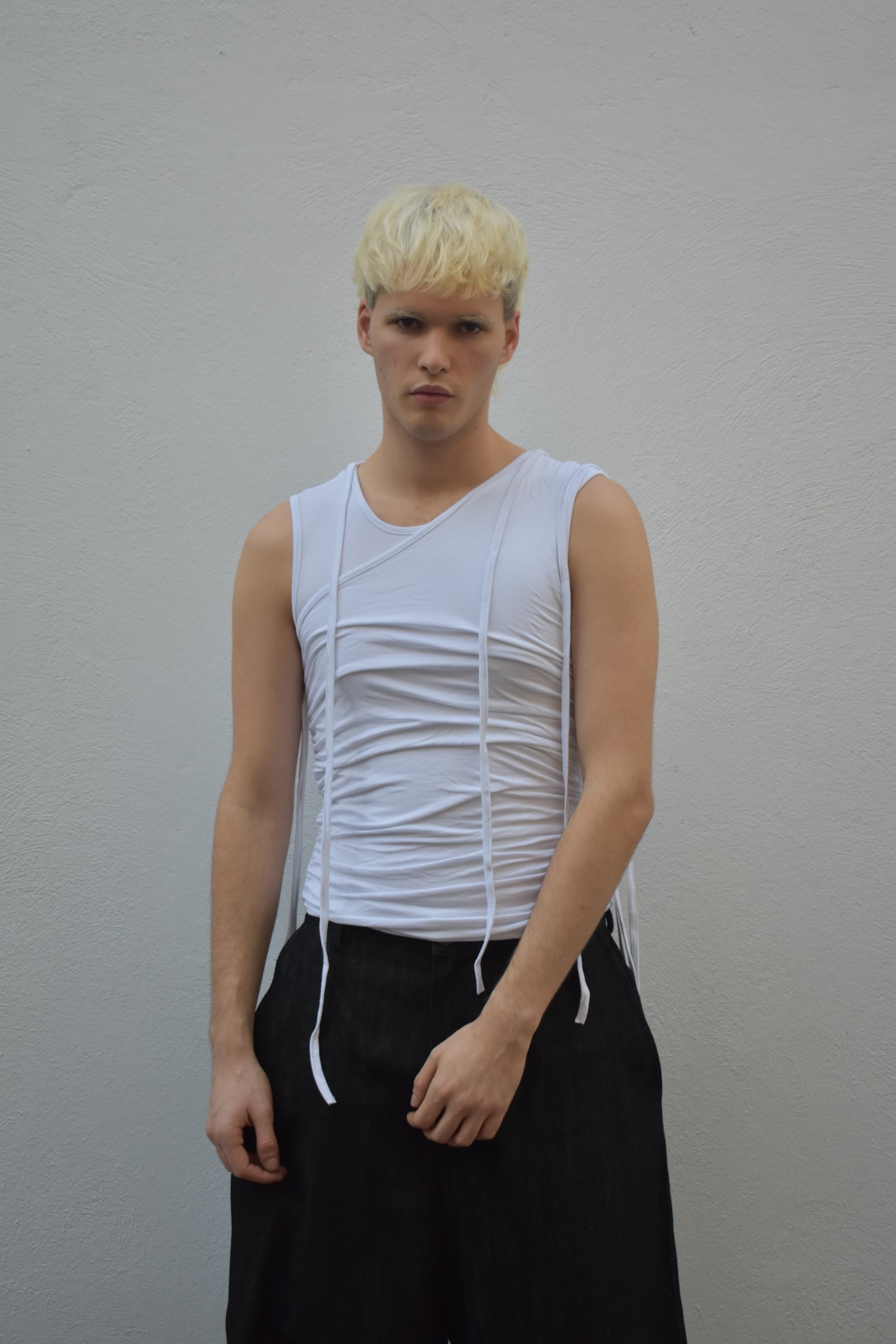Double-layer tank top joined at the hem. The outer layer folds upwards, creating a layered effect.
