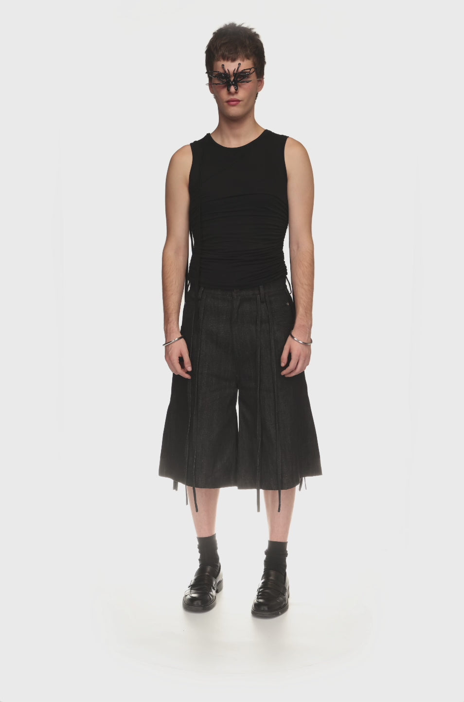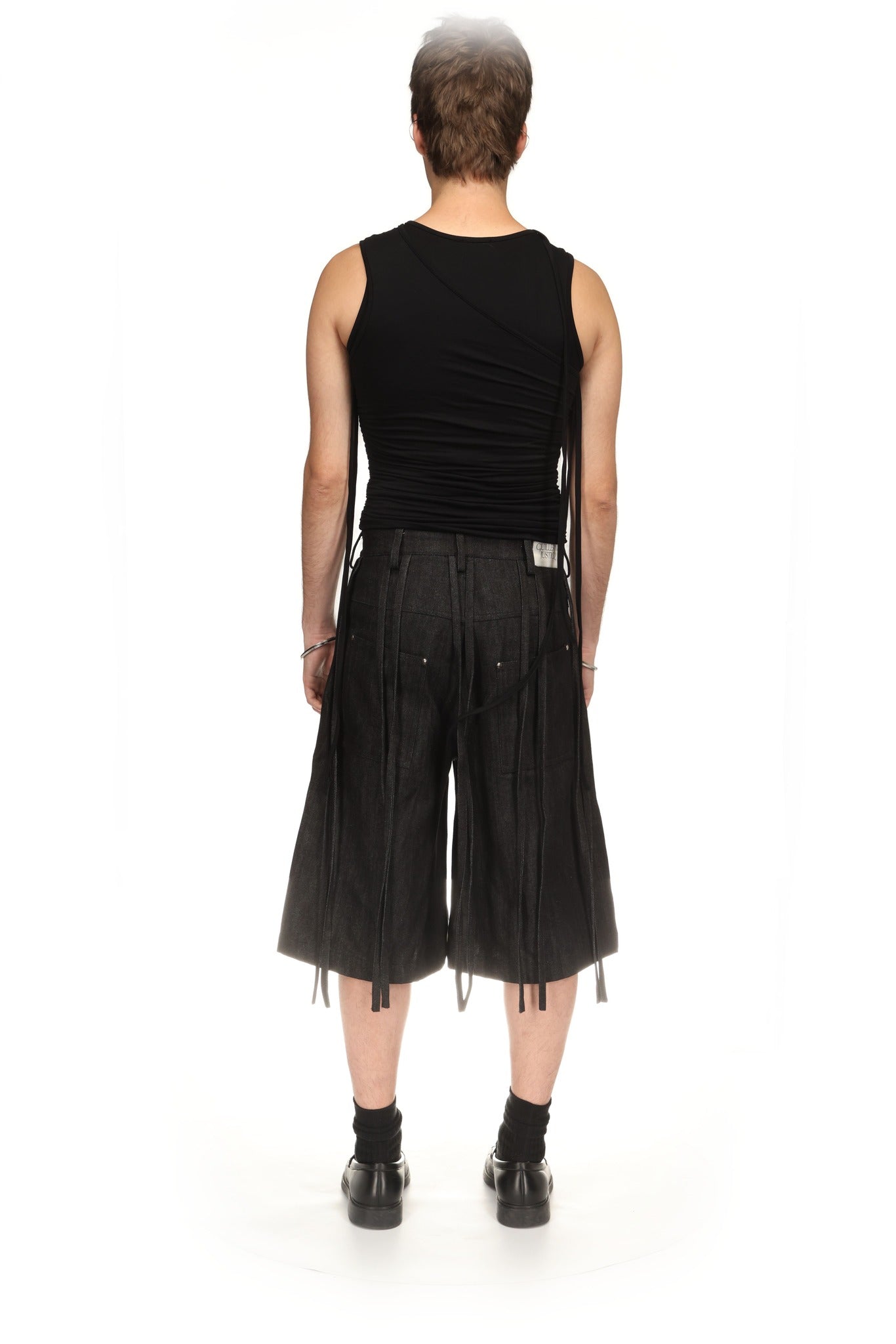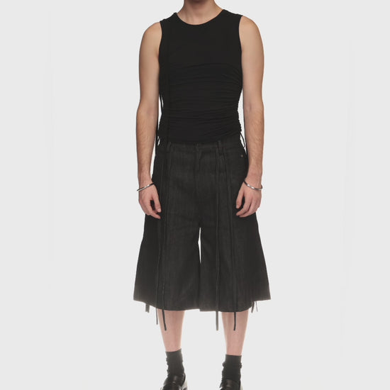 Double-layer tank top joined at the hem. The outer layer folds upwards, creating a layered effect.